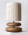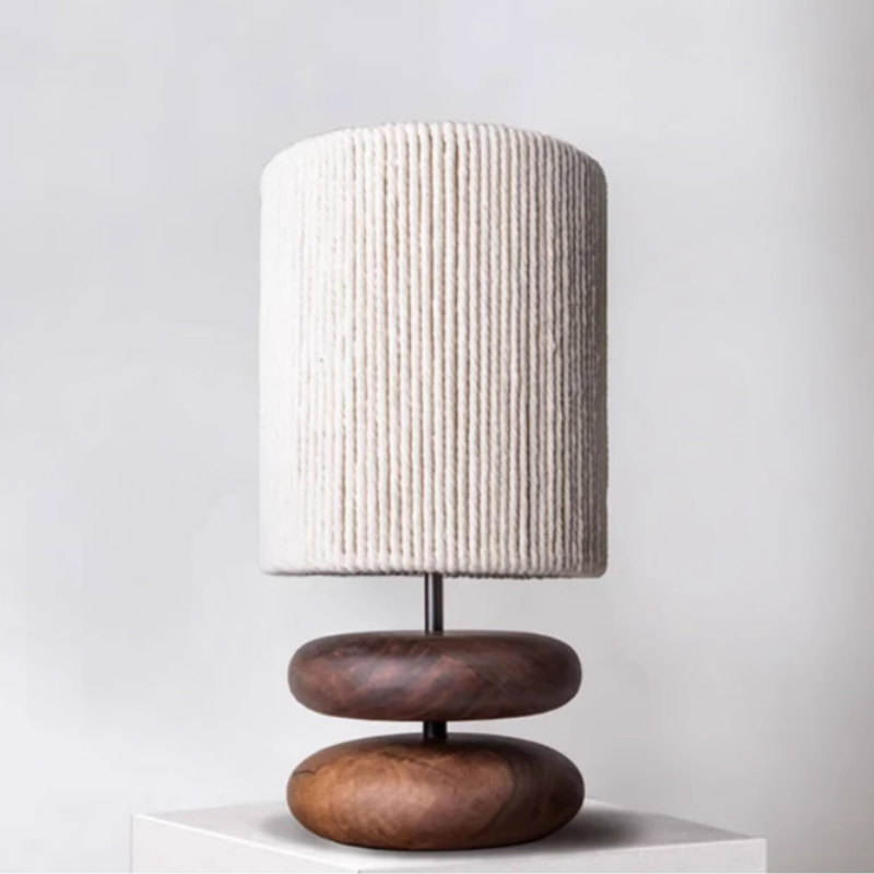 The lamp features a base composed of elegantly stacked wooden elements in rich brown and dark brown tones, offering a warm, earthy appeal that complements any room. The cylindrical shade is adorned with a subtle texture and speckled patterns, allowing for a soft diffusion of light that creates a calming and inviting ambiance.