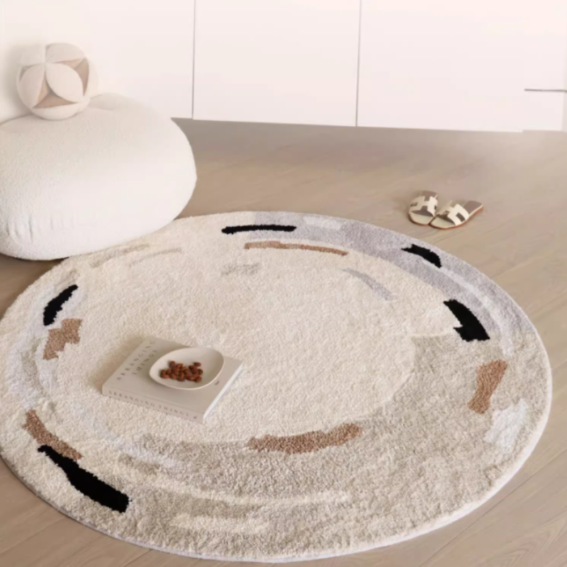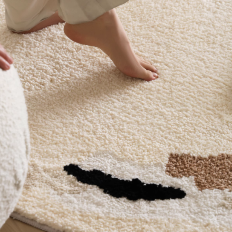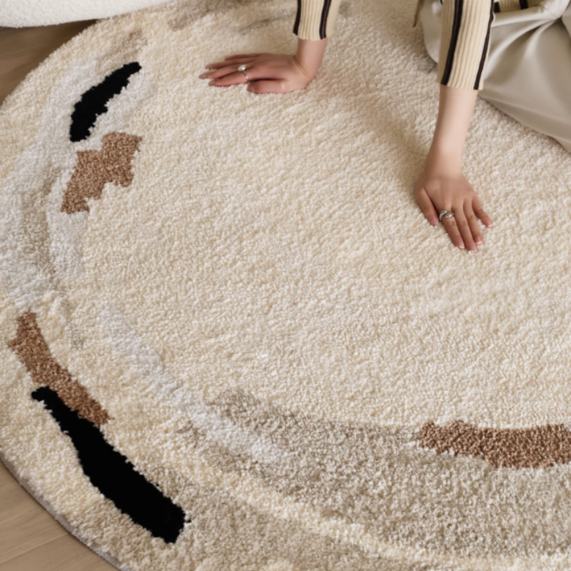 The rug features a unique pattern with abstract shapes and lines in a soothing palette of neutral and earth tones, complemented by bold black accents. The soft, plush texture underfoot is as inviting as it is striking, making it a perfect centerpiece for living rooms, bedrooms, or nurseries.